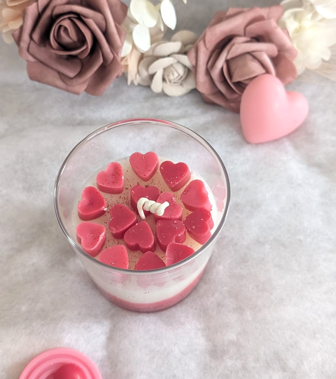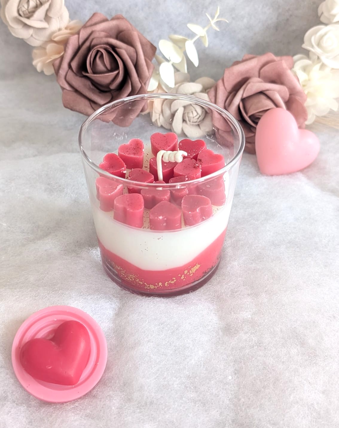 Une bougie de Saint-Valentin romantique avec ses petits coeurs qui évoquent l’amour. Ce modèle marie esthétisme, symbolique et qualité artisanale. Offrir une bougie parfumée de Saint-Valentin pour célébrer l’amour, c’est bien plus qu’un simple cadeau car tu peux la personnaliser avec des mots tout doux. C’est un geste tendre, une attention qui réchauffe le cœur.