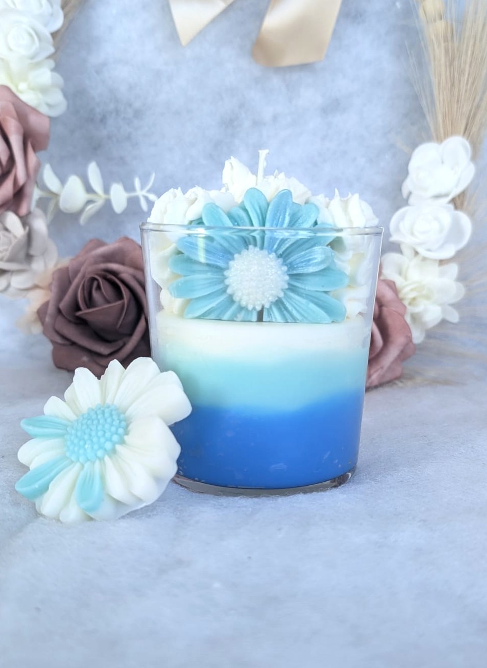 Sur sa chantilly de cire végétale toute légère, on a déposé une jolie fleur bleue sculptée qui apporte immédiatement ce petit côté « wahou » à ton intérieur. On est loin des bougies industrielles toutes simples : ici, c’est de l’artisanal pur, fait avec amour, pour ceux qui aiment les objets qui ont une âme.